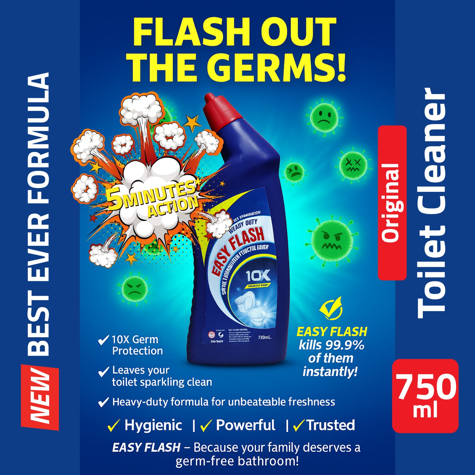 Say goodbye to hidden germs and stubborn stains with – EASY FLASH – Extra Power Liquid Toilet Cleaner.